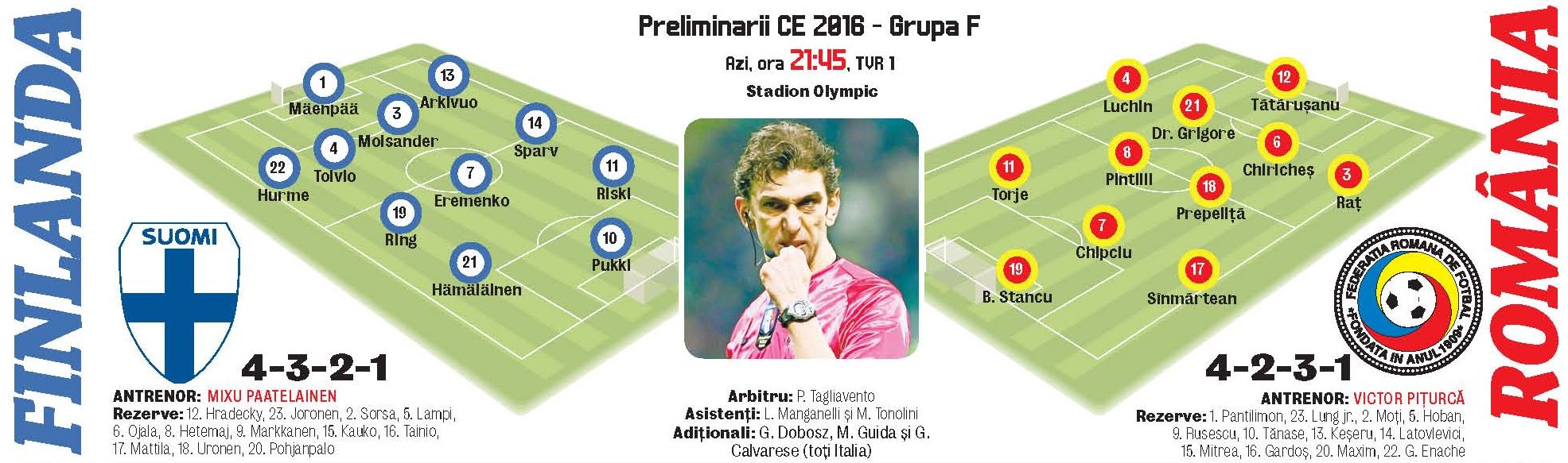 Dacă trupa gazdă e recunoscută în ultimele campanii pentru jocul tacticizat pe care îl afişează, România se remarcă prin sclipiri de moment. Arma principală a Finlandei o reprezintă mijlocaşul lui ŢSKA Moscova, Roman Eremenko, care a bifat unul dintre cele patru goluri înscrise de gazde în grupă.