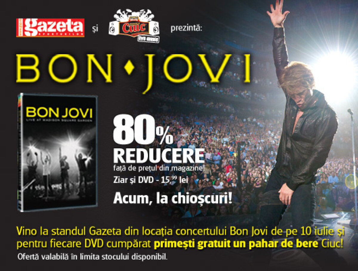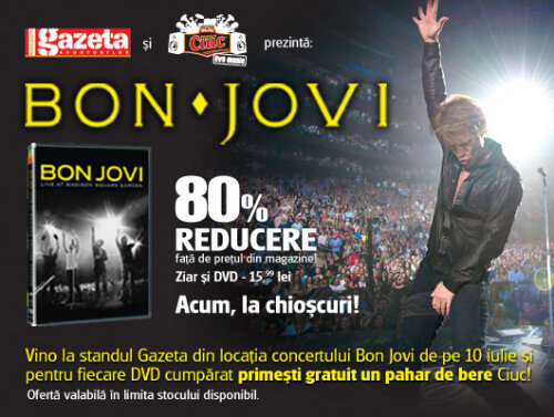 DVD-ul Bon Jovi – Live at Madison Square Garden va avea un tiraj suplimentat AZI, 7 iulie. După ce tirajul iniţial de DVD-uri, miercur s-a epuizat, Gazeta vine AZI cu o suplimentare pentru fanii genului. Mai mult, pe data de 10 iulie, în locaţia concertului Bon Jovi, la standul Gazetei Sporturilor veţi putea achiziţiona DVD-ul Bon Jovi – Live @ MSG, iar pentru fiecare DVD cumparat veţi primi gratuit un pahar de bere (oferta valabilă în limita stocului).
