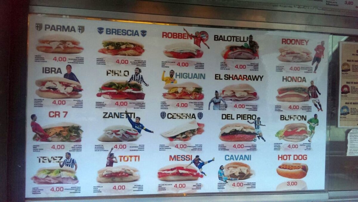Comerciantul a avut ideea de a-și atrage clientela prin branduirea fiecărui sandwich cu numele unor fotbaliști celebri, ale unor formații din Serie A și din UEFA Champions League.