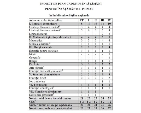 Ministerul Educaţiei a publicat noul proiect de plan-cadru pentru învăţămîntul primar. Planul cadru cuprinde materiile obligatorii, pe cele opţionale, dar şi numărul de ore alocat fiecărei materii pe săptămînă. Documentul va fi supus dezbaterii publice pînă la data de 19 februarie 2013.