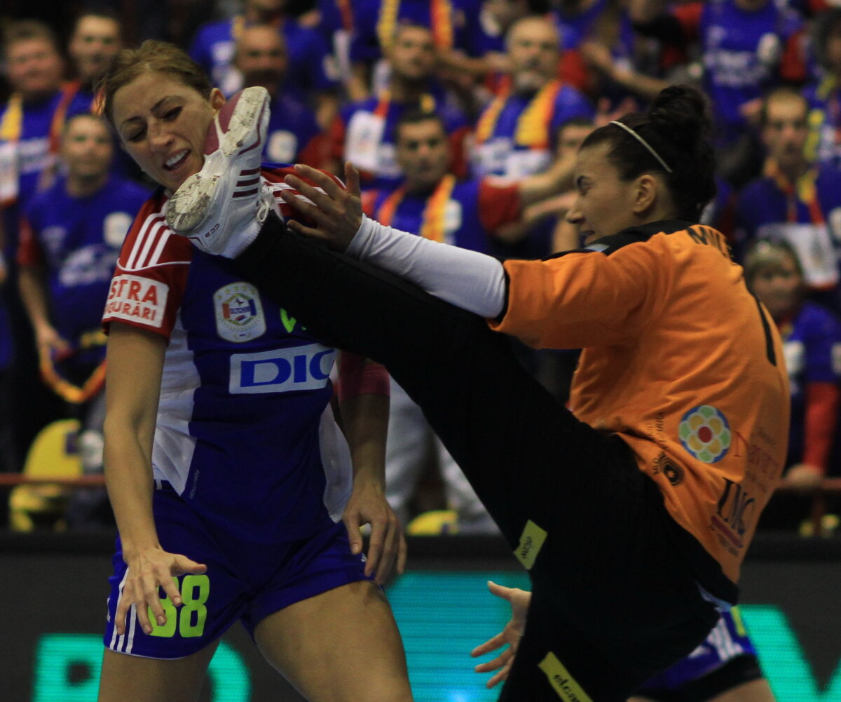 : ATAC PERICULOS. După această intervenție de catch a portarului Milenkovici, de la Itxako, Patricia Vizitiu s-a ales cu fractură de piramidă nazală și a ratat Mondialul. FOTO Marius Ionescu