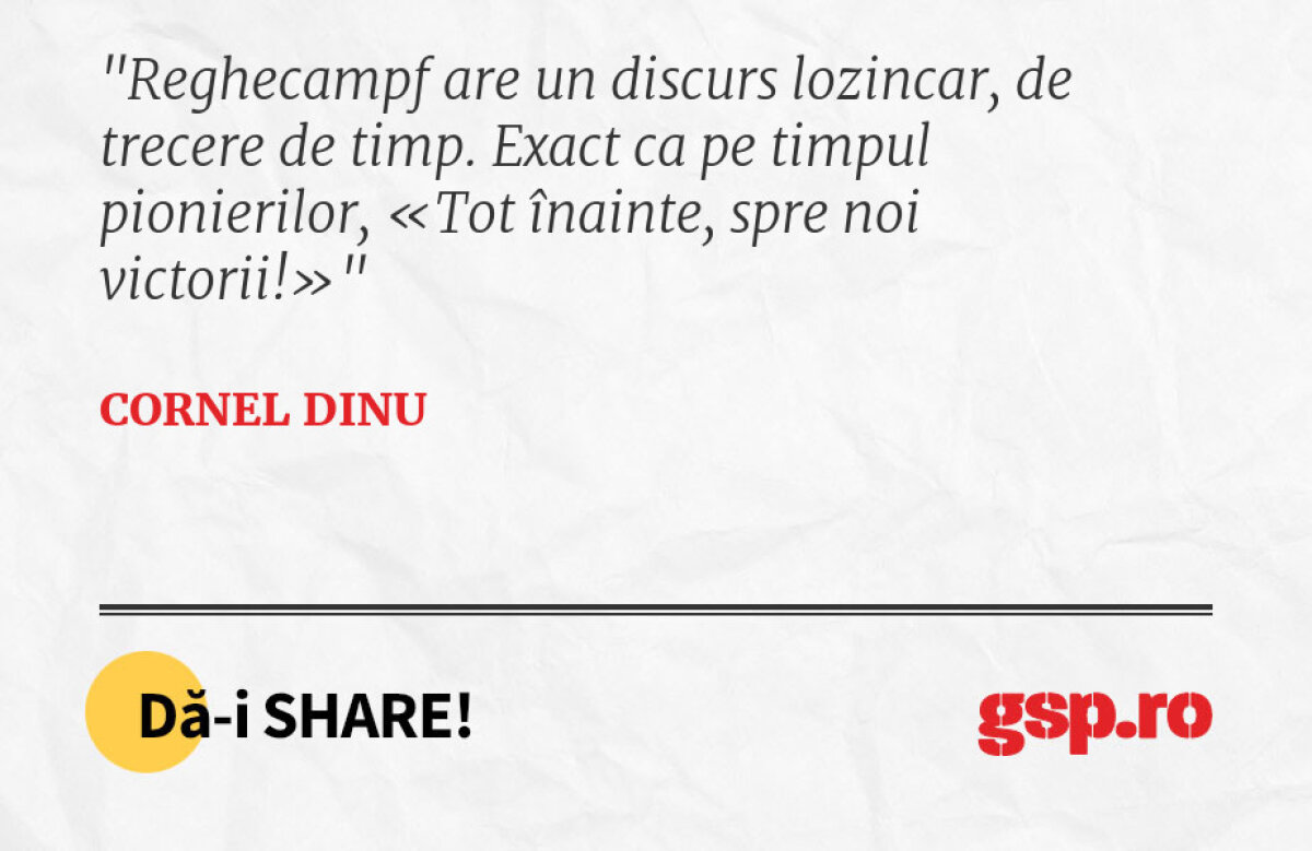 : Reghecampf are un discurs lozincar, de trecere de timp. Exact ca pe timpul pionierilor, «Tot înainte, spre noi victorii!»