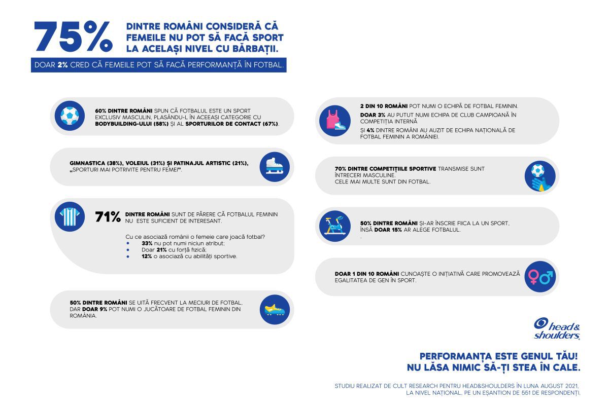 Pentru a schimba aceste percepții, Head&Shoulders, brandul P&G care încurajează consumatorii să aibă încredere în ei pentru a depăși provocările zilnice, devine susținătorul oficial al Echipei Naționale de Fotbal Feminin a României și lansează campania locală Performanța este genul tău!, prin care își propune să transmită tinerilor să nu lase nimic să stea în calea visului lor și, totodată, să contribuie la schimbarea percepției românilor în legătură cu egalitatea de gen în sport.