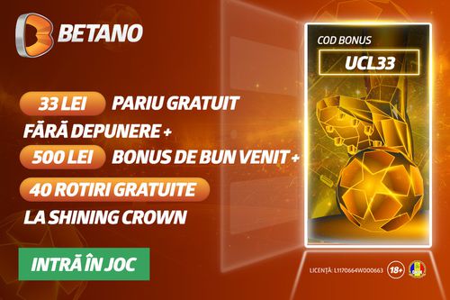 Înregistrează-te ACUM pe Betano folosind codul promoțional UCL33, iar noi te răsplătim cu un Free Bet în valoare de 33 de LEI pentru spectacolul serilor europene, până la 500 lei 100% Bonus de Bun Venit după prima depunere, iar ziua următoare, vei primi 40 de Rotiri Gratuite la Shining Crown!