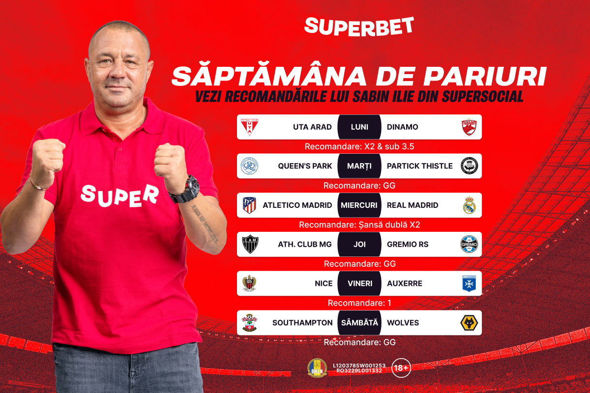 A început o nouă săptămână de pariuri cu fotbal din plin! De la Superliga până la Liga Campionilor, vezi recomandările lui Sabin Ilie din SuperSocial.