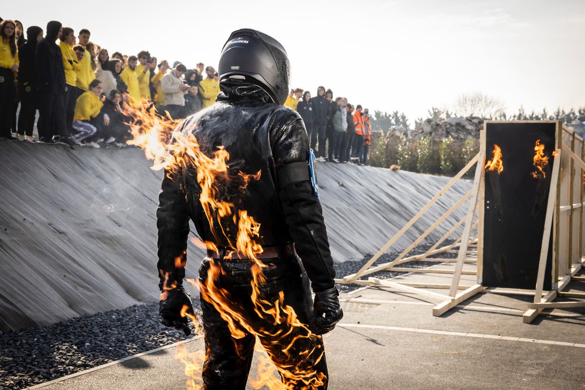 Cascadorul Renaud Favero a străbătut șase uși în flăcări în mai puțin de șase secunde, în timp ce și corpul său era cuprins de foc. Fiecare dintre portalurile în flăcări măsurau 210cm x 90cm x 4cm și au fost situate la distanță de doi metri.