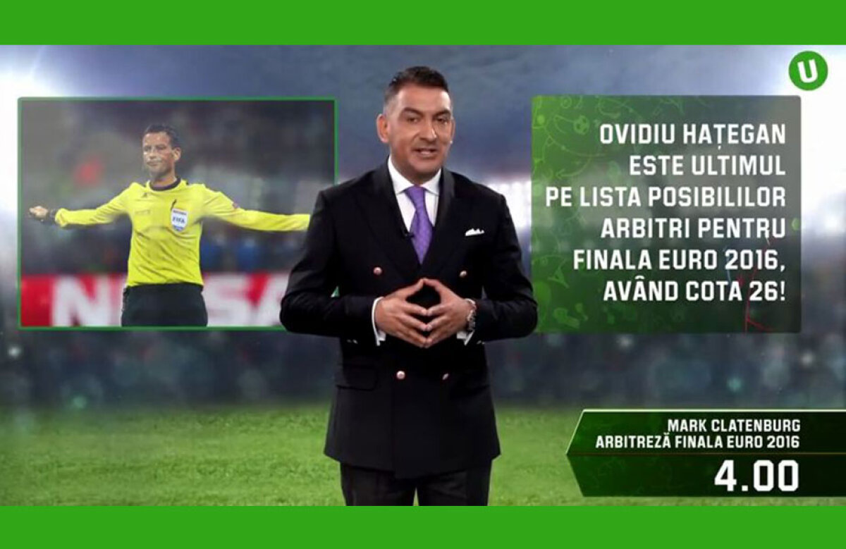 “In 2012, Pedro Proenca a oficializat la centru finala Ligii Campionilor si, apoi, finala Campionatului European, organizat in Polonia si Ucraina. Luand in calcul acest indiciu, ajungem la englezul Mark Clattenburg, pe care l-am vazut recent arbitand finala de la Milano, dintre Real si Atletico de Madrid”, spune Ilie Dumitrescu. Unibet ofera o cota de 4,00 celor care mizeaza ca englezul va fi la centru pe 10 iulie. Cei ce prefera o cota si mai mare - 26, pot opta pentru varianta Ovidiu Hategan. Romanul este ultimul pe lista variantelor pentru arbitrul finalei.