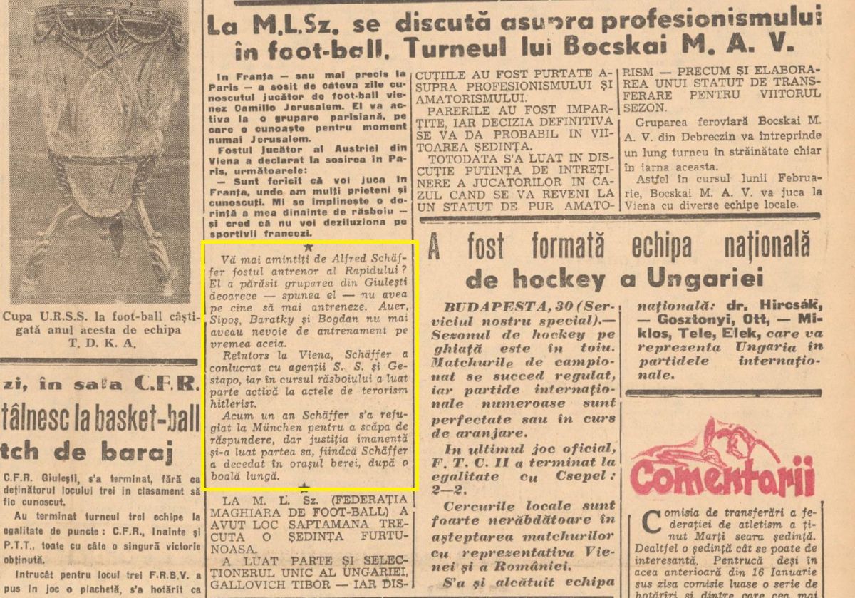 : Rândurile din „Sportul Popular” în care se menționează legăturile lui Alfred Schaffer cu SS și Gestapo
