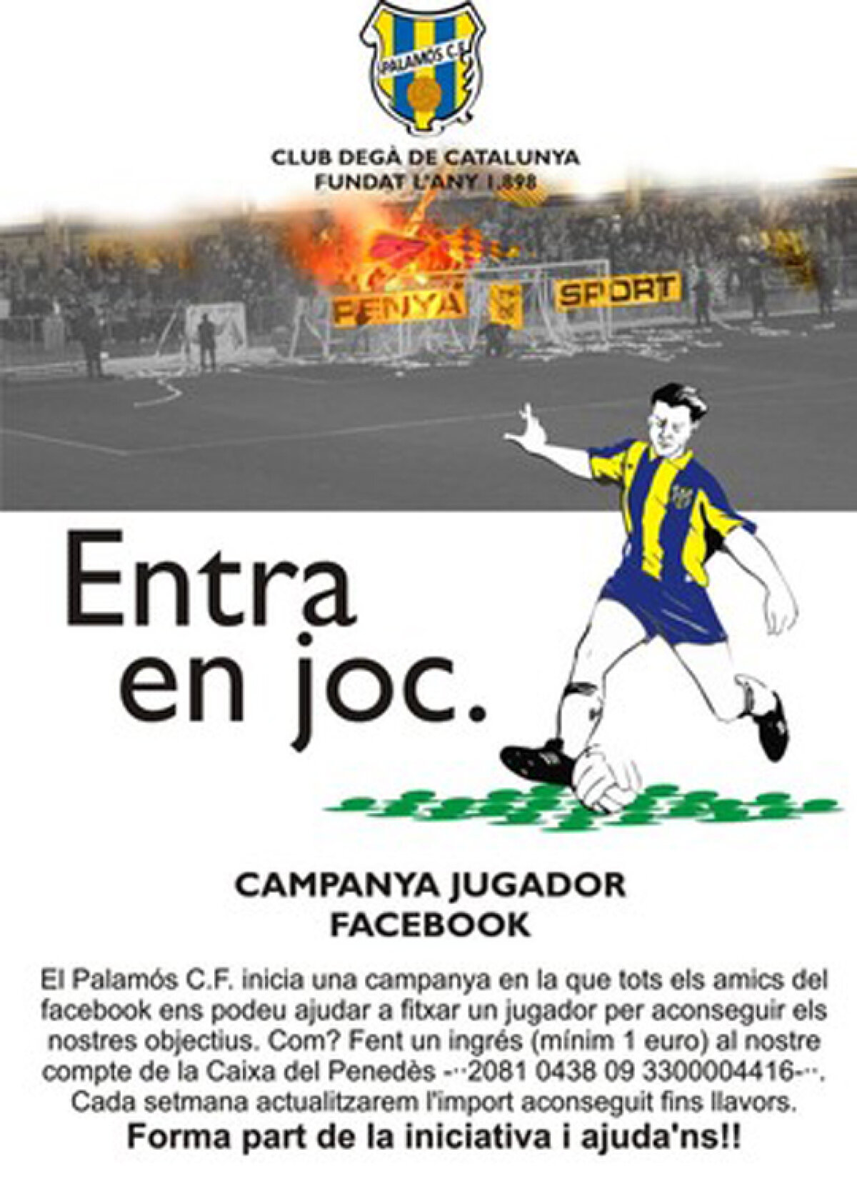 CE Palamos este o echipă din a treia divizie spaniolă. Pînă aici, nimic deosebit. Dar ideea pe care au avut-o conducătorii grupării, confruntaţi cu probleme economice, este una deosebită: au lansat pe Facebook o campanie de achiziţionare a unui jucător.
