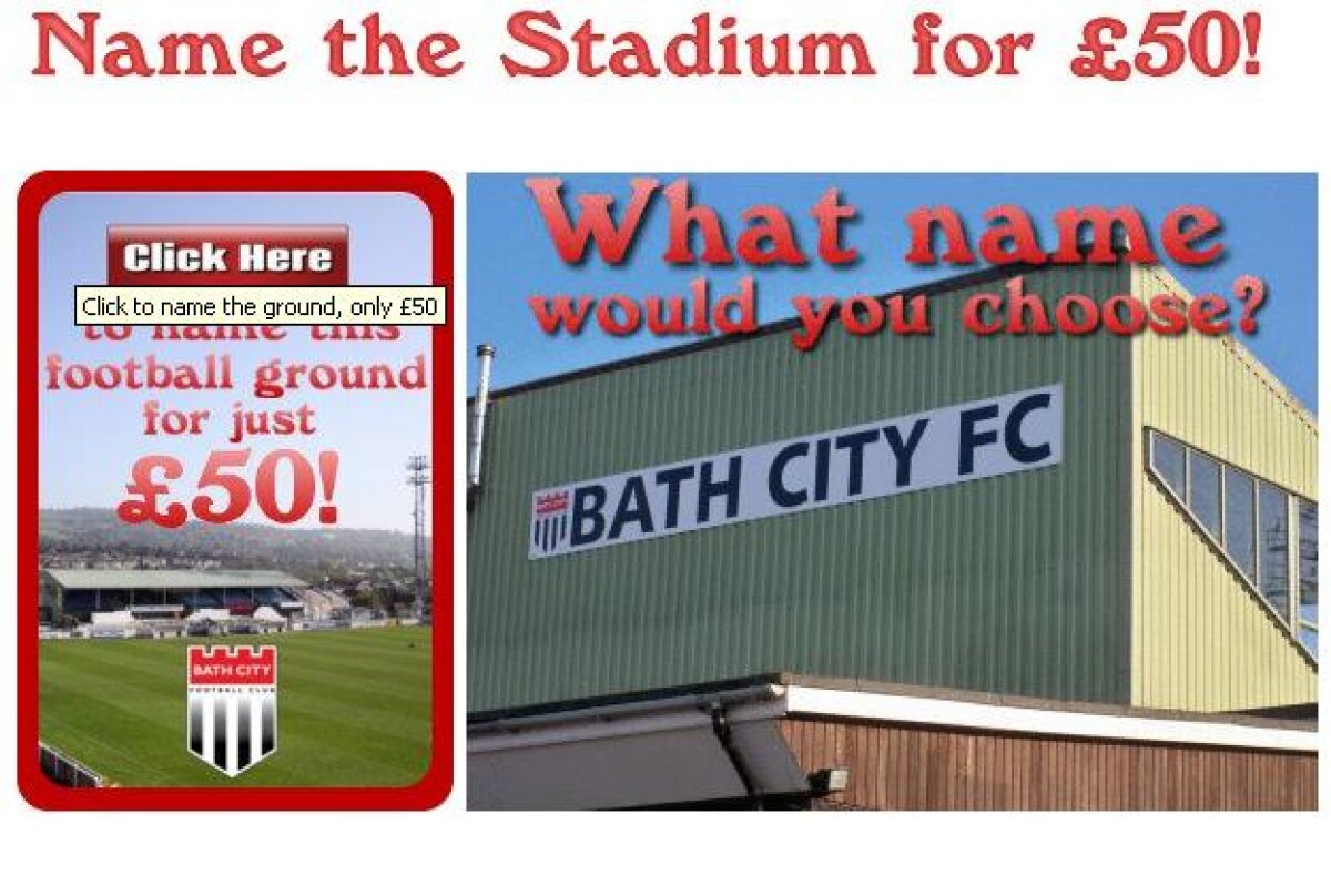 Bath City e un club semi-profesionist din Anglia, dar stă bine la capitolul marketing. Fanii pot cumpăra 4 bilete în schimbul a 50 de lire şi cel care va ieşi cîştigător la tragerea la sorţi va da numele stadionului de 8.800 de locuri.