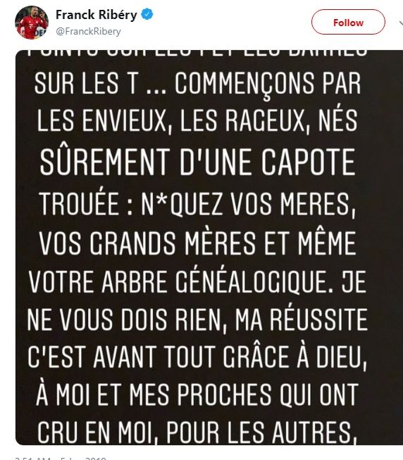 Să vă f*t mamele, bunicile și tot arborele genealogic! Nu vă datorez nimic, tot succesul i se datorează lui Dumnezeu, mie și apropiaților care au crezut în mine. Restul sunt doar pietricele în șosetele mele", a fost mesajul postat de Ribery pe Twitter, într-o postare care a fost redistribuită de 29 de mii de oameni în doar câteva ore.