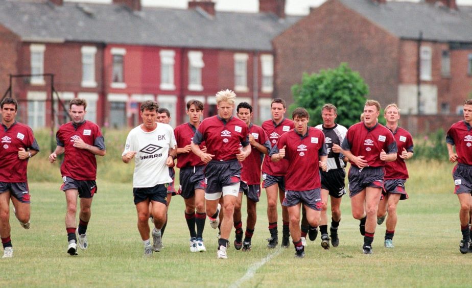 Jucătorii lui United, între care Gary Neville și David Beckham, antrenându-se în baza de la Cliff în 1995