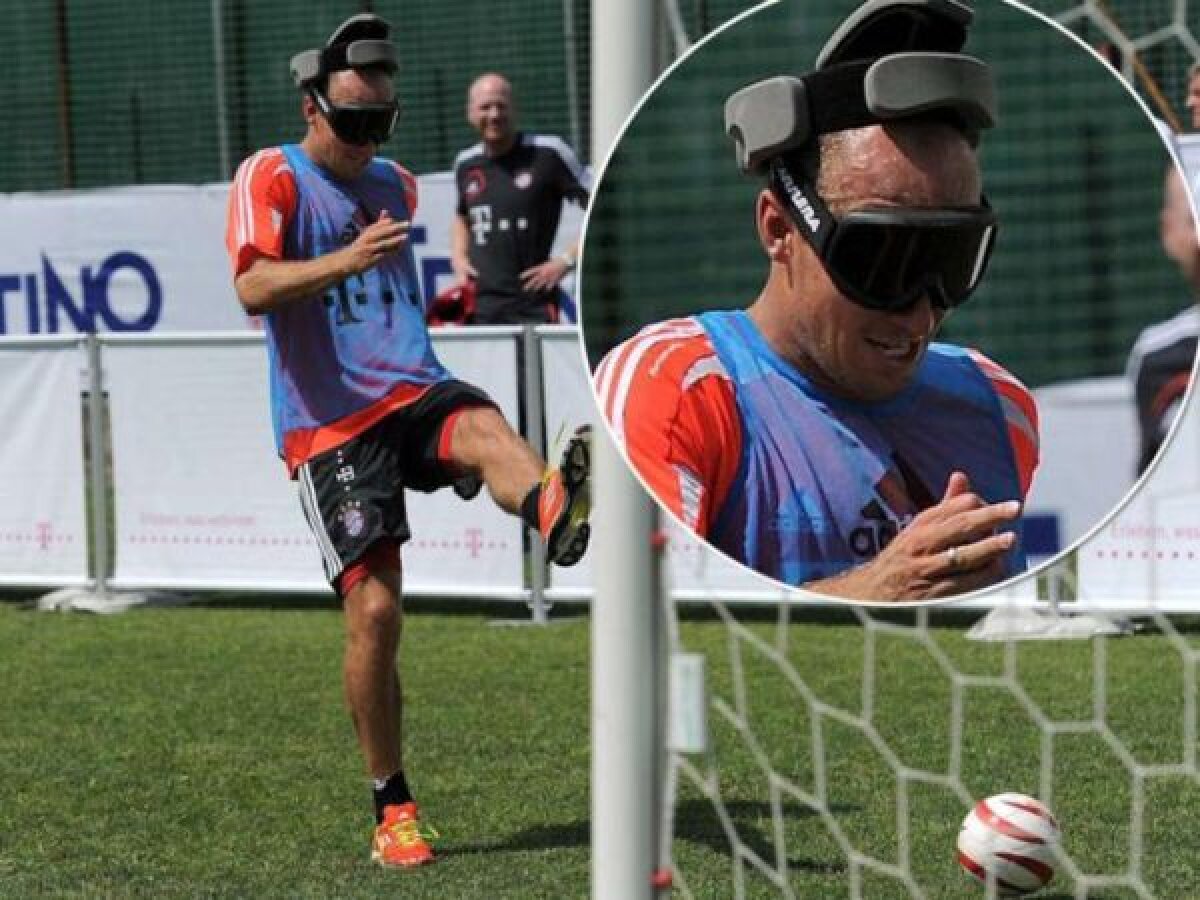 În cantonamentul lui Bayern de lîngă lacul Garda (Italia), olandezul şi colegii săi au primit căşti de protecţie speciale şi ochelari cu lentile ce obturează complet vederea. Astfel echipat, Robben (foto) a făcut mari eforturi să controleze balonul, să paseze şi să şuteze la poartă. Cel mai adesea, zadarnic.