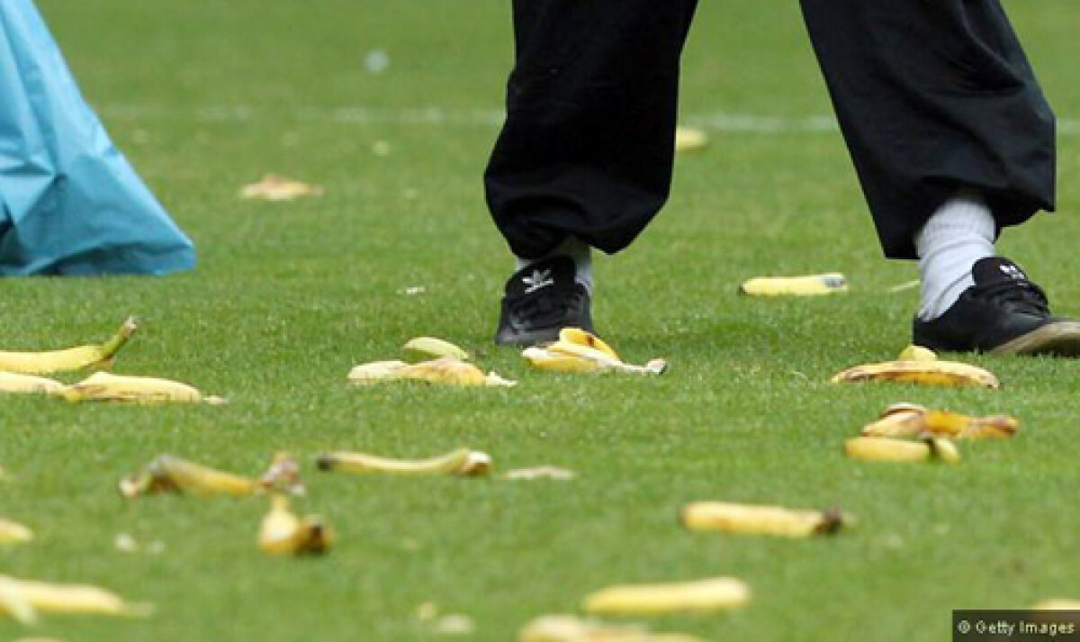 Microbiştii au aruncat pe teren cu numeroase banane şi au reuşit să acopere o bună parte din suprafaţa de joc.
