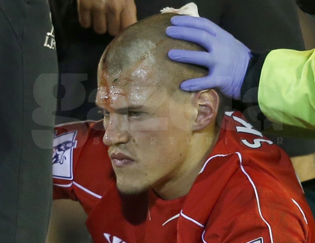 : RAMBO. Slovacul Skrtel (Liverpool) a avut nevoie de 7 minute de îngrijri și de 7 copci după ce Giroud (Arsenal) i-a spart capul