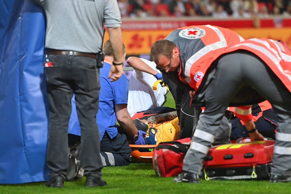 : Portarul lui Heindenheim, Kevin Muller, inconștient după ciocnirea cu Ibrahima Sissoko în meciul cu Bochum / Foto: Imago