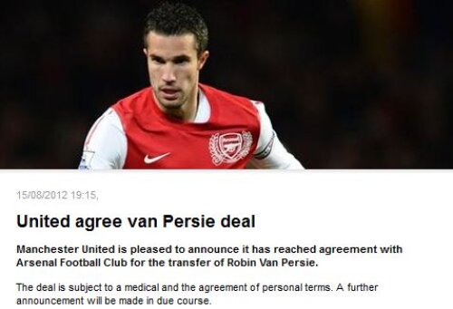 Manchester United a anunţat pe site-ul oficial (foto) că a ajuns la un acord cu Arsenal pentru transferul lui Robin Van Persie.