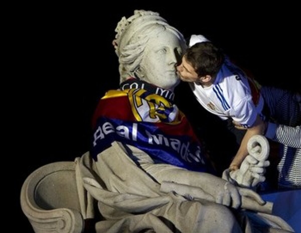 La 4:35, căpitanul Casillas s-a suit pe pasarela instalată special pentru băieţii lui Mourinho şi s-a urcat pînă la zeiţa Cibeles, pe care a pupat-o şi i-a agăţat de gît un steag al Spaniei cu emblema lui Real Madrid, în delirul miilor de suporteri ai "galacticilor". Jucătorii madrileni nu l-au avut însă alături la plecare în autocar şi pe Mourinho, artizanul marelui triumf de pe "Mestalla". Tehnicianul portughez, aruncat de elevii săi pe braţe la stadion, a plecat din piaţă cu duba poliţiei, "dar nu în calitate de deţinut", cum a comentat sarcastic Marca.