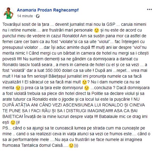"Tovarășul sosit de la țară ... devenit jurnalist mai nou la GSP ... căruia nimeni nu-i reține numele.... are frustrări mari personale și nu este de acord cu punctul meu de vedere în cazul Ronaldo! Am să susțin până mor că astfel de femei care cer bani că au fost “violate”si ca sa uite “violul”... fac înțelegeri cu presupusul violator ....dar își aduc aminte după foarte mulți ani iar despre “viol”nu merita nimic!