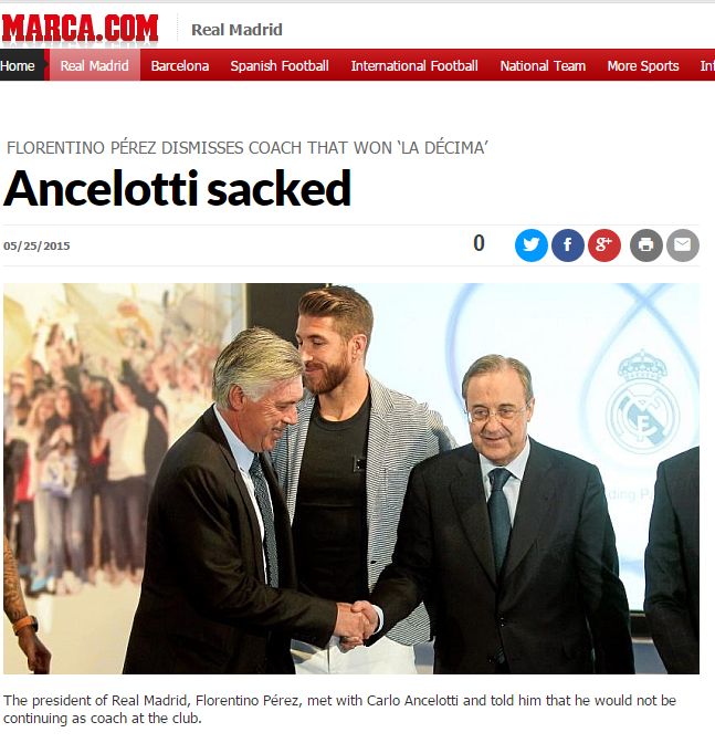 "Am decis să renunțăm la colaborarea cu antrenorul Carlo Ancelotti. A fost o decizie dificilă. Nu am venit aici la Real Madrid să luăm decizii ușoare, ci pe cele care credem că sînt cele mai bune pentru cea mai bună echipă din lume. Carlo face parte din istoria noastră, este antrenorul care ne-a adus a zecea Ligă. E momentul să dăm un nou impuls care să ne permită cîștigarea de titluri într-o nouă etapă. Îi mulțumesc pentru munca sa din acești doi ani, îi transmit că aceasta rămîne casa sa. Săptămîna viitoare vom ști numele noului antrenor al lui Real Madrid. Nu le-am transmis încă jucătorilor decizia", a declarat Perez.