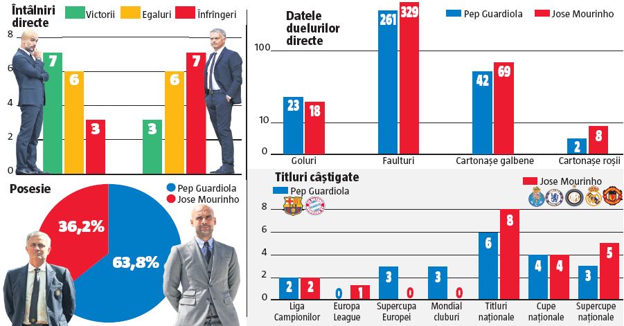 Patru grafice, o concluzie. Fotbalul de posesie al lui Pep e mai de succes decât jocul pragmatic cultivat de Jose. Mai îndrăgostite de balon, echipele pregătite de tehnicianul spaniol au înscris mai mult în întâlnirile directe, au faultat mai puțin și, în consecință, au încasat și mai puține avertismente. Iar acolo unde contează, la titluri, Guardiola i-a luat fața adversarului său de mâine: 21 de titluri câștigate, în doar 7 ani de antrenorat, față de 20 ale lui Mourinho, în 13 sezoane.