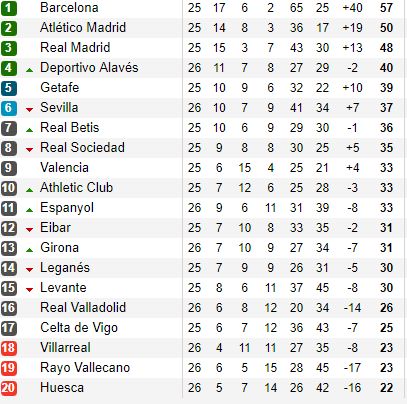 Barcelona acumulează 60 de puncte și e în mare măsură campioană în La Liga! Catalanii au un avans de 10 puncte față de Atletico Madrid și nu mai puțin de 12 lungimi peste rivala Real Madrid.