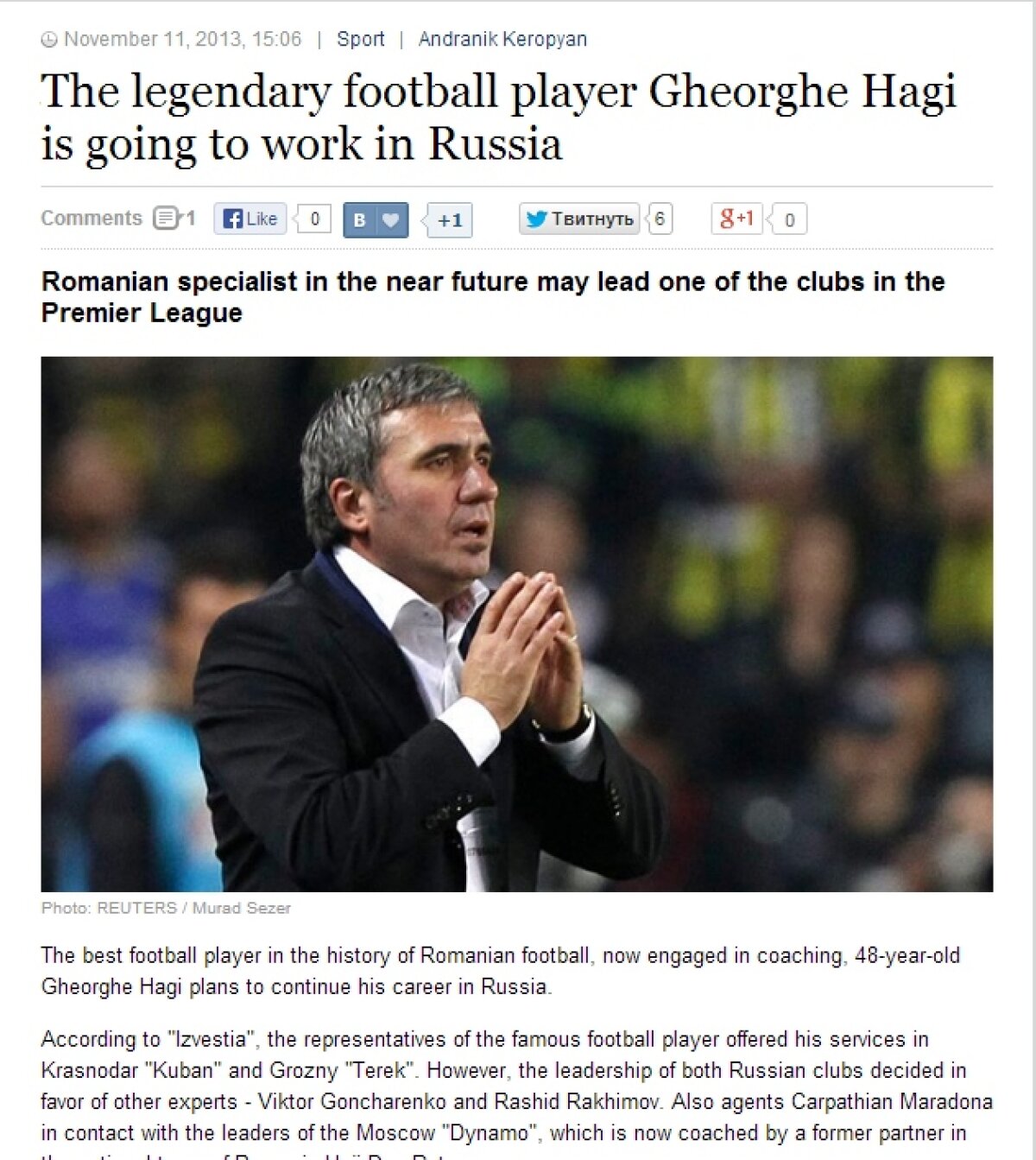 "Impresarii lui Maradona din Carpaţi sînt în contact cu oficialii celor de la Dinamo Moscova, echipă care în prezent este antrenată de un fost coechipier al lui Hagi de la echipa naţională, Dan Petrescu", au scris cei de la Izvestia.