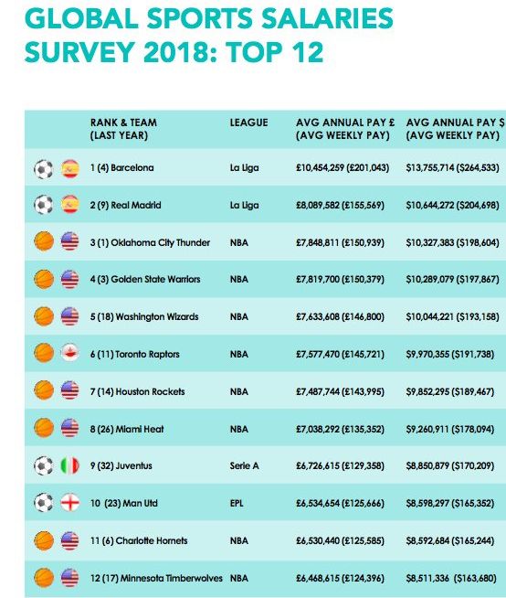 În acest top, Barcelona e urmată de rivala Real Madrid, în timp ce podiumul e completat de echipa din NBA Okhlahoma City Thunder. În TOP 10 se mai regăsesc doar două echipe de fotbal, Juventus și Manchester United, care se situează pe locurile 9, respectiv 10.