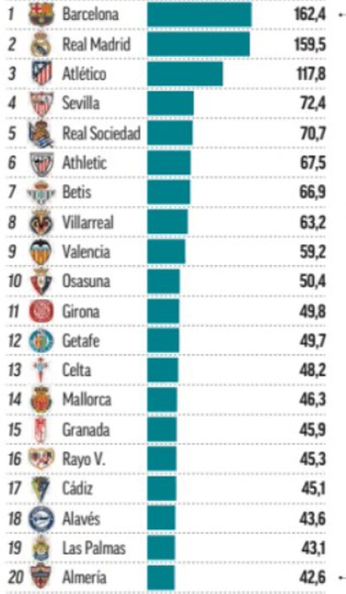 : Banii încasați stagional de cluburile din LaLiga. Sumele sunt în milioane de euro