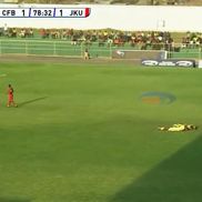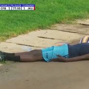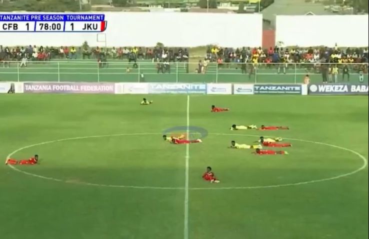 Meciul dintre City FC Abuja și JKU FC, din Tanzania, a oferit momente rar văzute pe terenul de fotbal. Toți jucătorii aflați pe gazon s-au aruncat la pământ și au stat nemișcați secunde bune, în minutul 78.