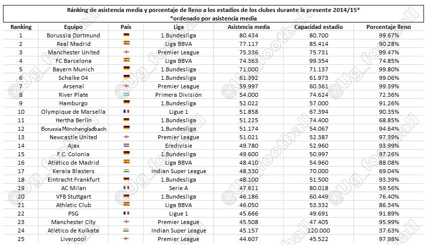 Loc / Echipă / Ţară / Campionat / Asistenţă medie / Capacitatea arenei / Procentaj de ocupare