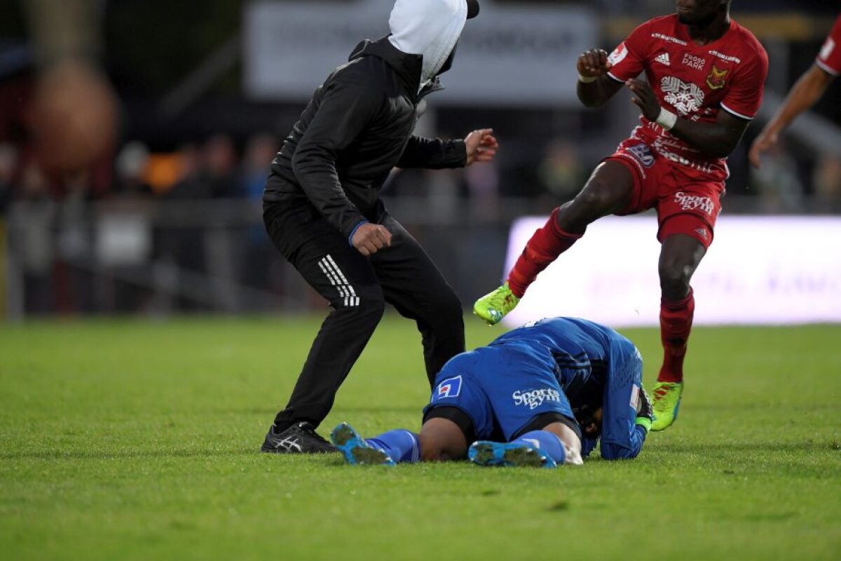 VIDEO+FOTO Momente de groază la un meci din Suedia! Un mascat l-a apucat de gât pe portar, care a avut nevoie de îngrijiri medicale