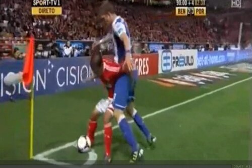 Suporterii pîndesc orice ocazie pentru a specula momentele inedite pe care un meci de fotbal le poate oferi. A fost nevoie de doar cîteva secunde dintr-un duel Maxi Pereira - Mark Janko din Benfica - Porto 2-3, meci disputat în urmă cu o săptămînă, pentru a se ajunge la un clip amuzant, care face senzaţie pe internet.