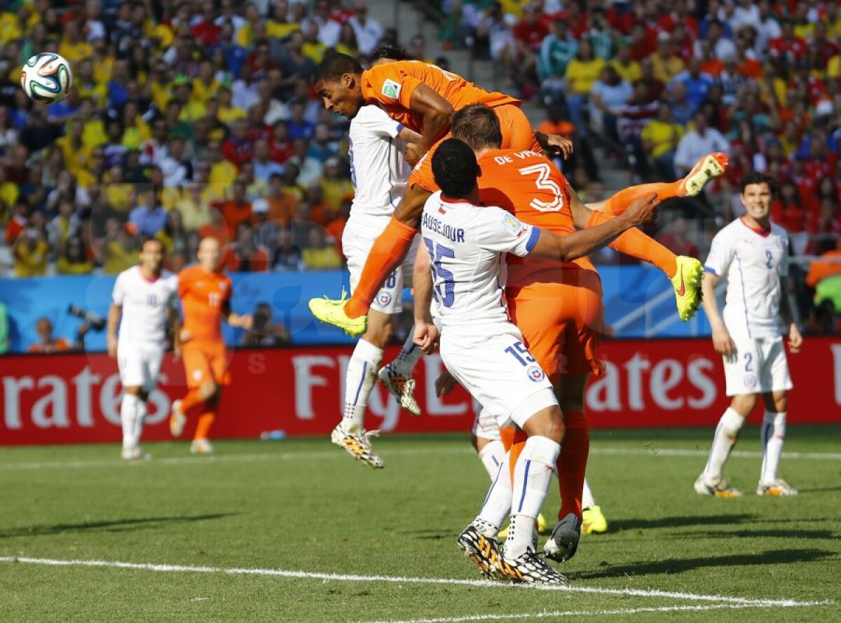 Pînă la pauză, chilienii au protestat de trei ori, cerînd lovituri de pedeapsă, dar arbitrul gambian Gassama i-a refuzat de fiecare dată. O dată a fost însă. Cînd Kuyt l-a împins pe Alexis în careu în minutul 35. La celelalte două, nici un fault. Nici la De Jong în faţa lui Aranguiz, nici la Vlaar în duelul cu Vargas. Poate că gambianul a aflat de protestul lui Van Gaal împotriva arbitrilor şi de aceea a închis ochii la Kuyt. În minutul 63, Alexis a cerut şi el penalty. N-a fost. Cillessen a atins mingea. În final, balonul s-a oprit în antebraţul lui De Vrij, dar arbitrul a considerat că a fost neintenţionat.