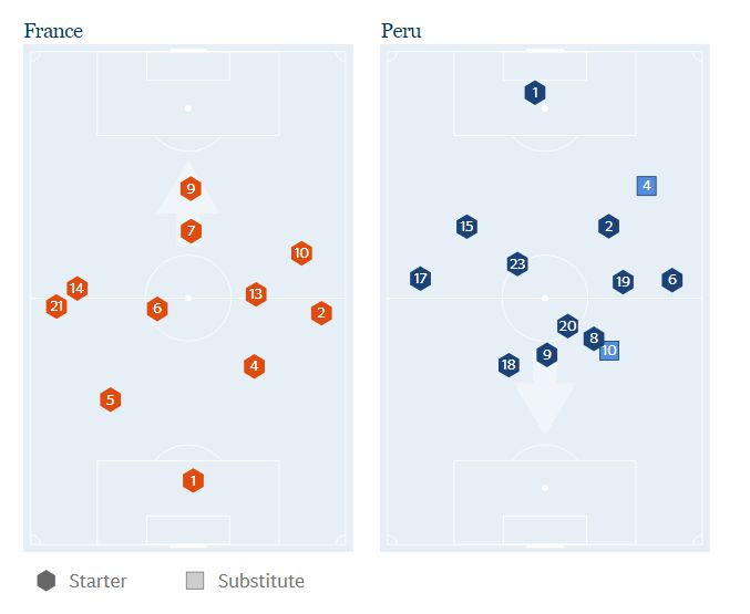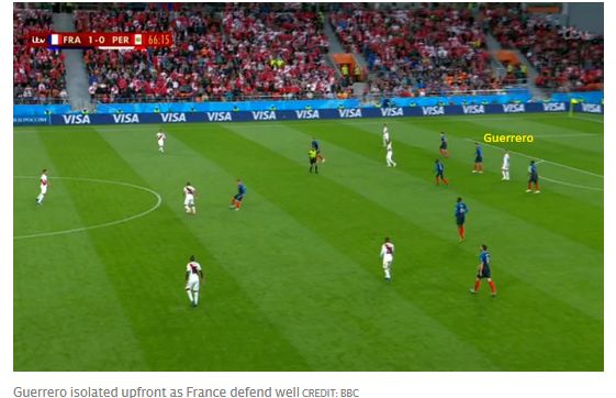 Când Peru a avut posesia, Franța l-a țintuit pe Guerrero între cei doi fundași centrali, plus un mijlocaș în fața lui.