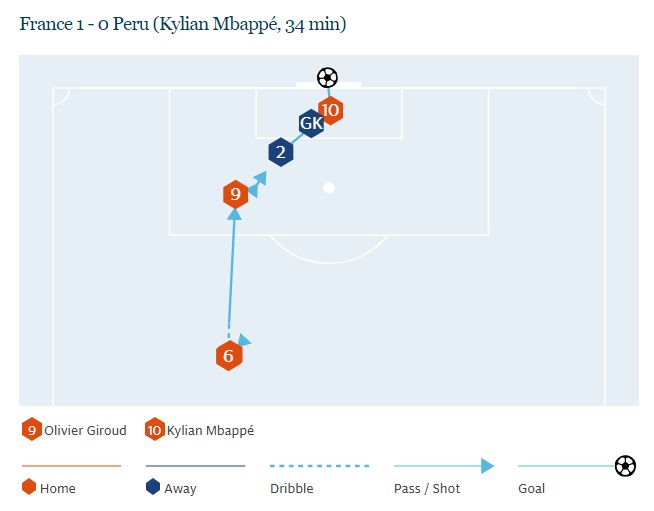 Disperat să se implice, atacantul a suferit un tackling regulamentar când încerca să iasă cu mingea din zona centrală, iar pasa ulterioară a lui Pogba l-a găsit în careu pe Giroud. Mingea șutată de francez a fost deviată de Rodriguez până la Mbappe, care a împins-o în poartă din 2 metri.