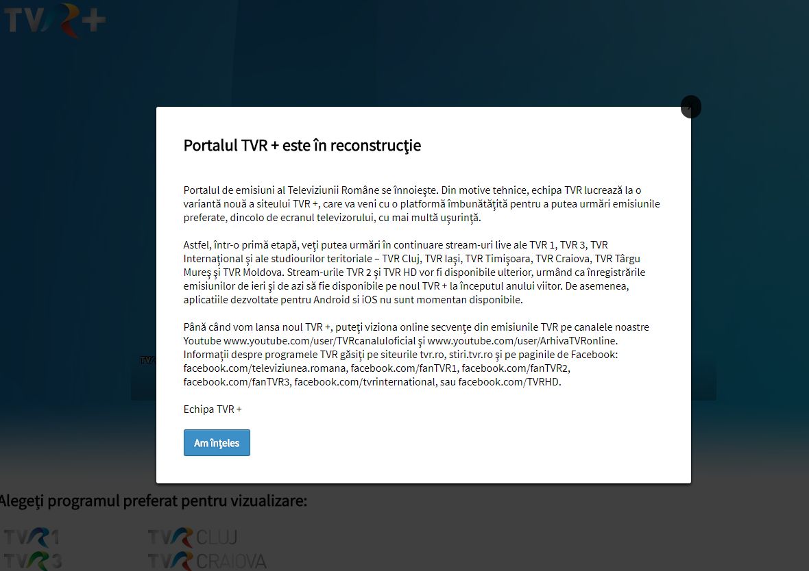 Dacă ai avut noroc și au reușit să accesezi totuși pagina, mesajul care te întâmpină este: "Portalul TVR+ este în reconstrucție".  Chiar în timpul Mondialului!