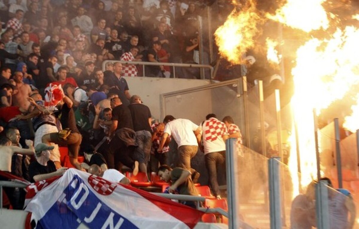 Scene desprinse din filmele de război în tribunele stadionului Georgios Karaiskakis din Pireu, la meciul Grecia - Croaţia (2-0). Fanii greci şi-au dat din nou în petic şi i-au asaltat pe fanii croaţi cu fumigene şi cocktailuri molotov. Arbitrul Howard Webb a întrerupt meciul, dar numai pentru şase minute.