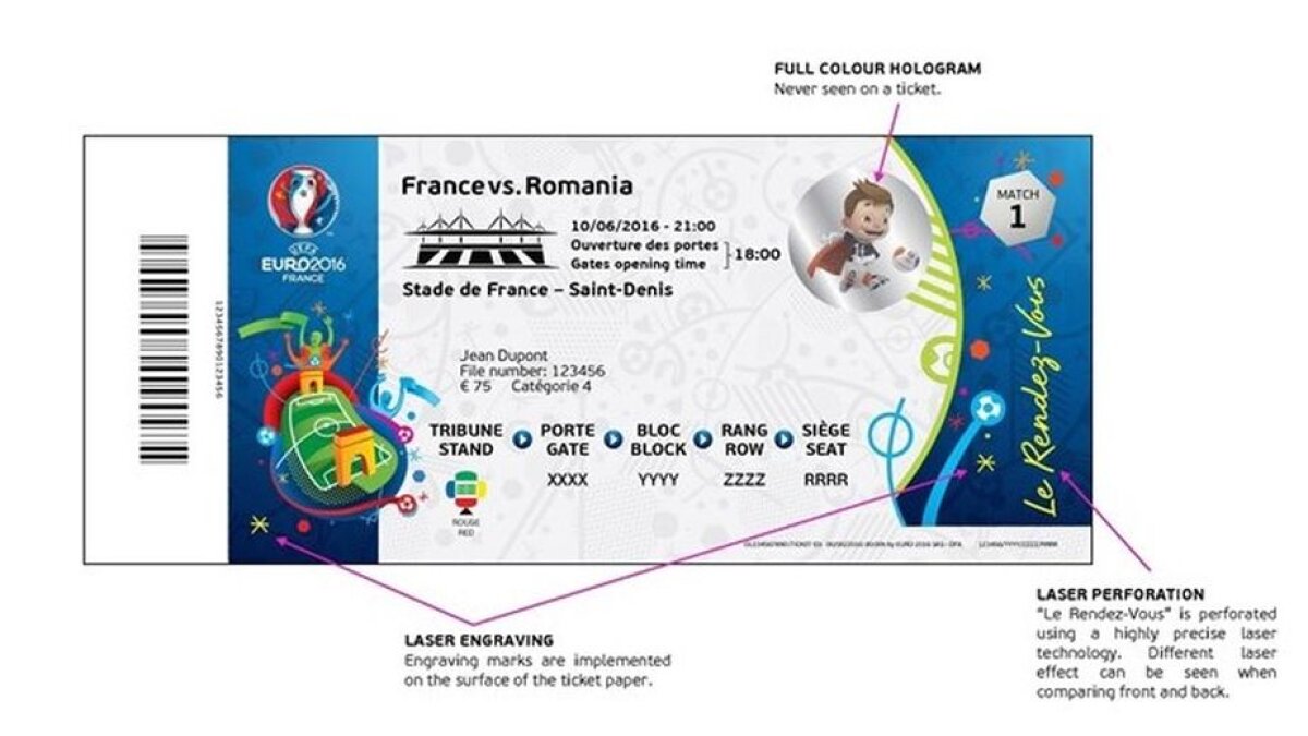 Holograma este chiar Super Victor, mascota acestui turneu. Pe bilet vor fi tipărite informații despre meci, stadion, ora deschiderii porților, prețul și locul.