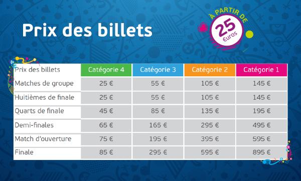La 43 de meciuri, cel mai ieftin bilet va costa 25 de euro. La partidele din grupă și optimile de finală prețul tichetelor va fi cuprins între 25 și 145 de euro, în funcție de locul ales.