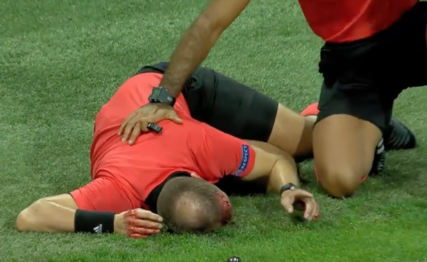 Fanii de pe Liebenauer Stadium din Graz au fost martorii unor momente teribile. Arbitrul tușier de pe partea băncilor de rezerve s-a prăbușit în agonie după ce o cutie plină cu bere l-a lovit direct în cap. Medicii au fost nevoiți să intervină de urgență pentru a stopa sângerarea arbitrului suedez.