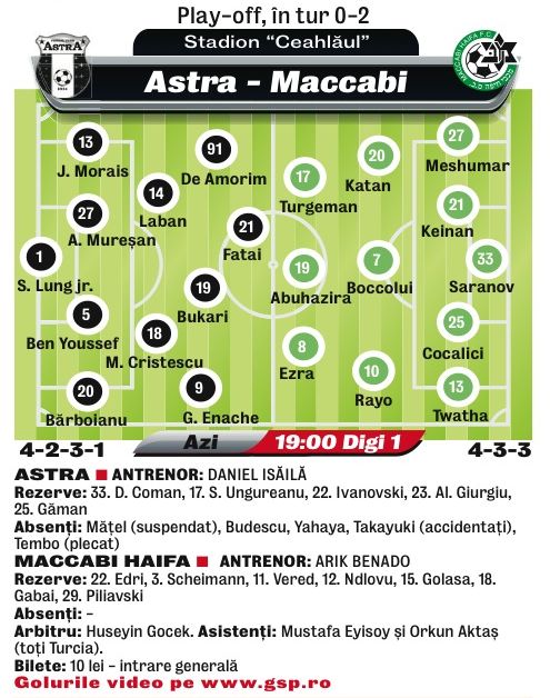 Astra - Maccabi (ora 19:00, Digi Sport 1, în tur 0-2)