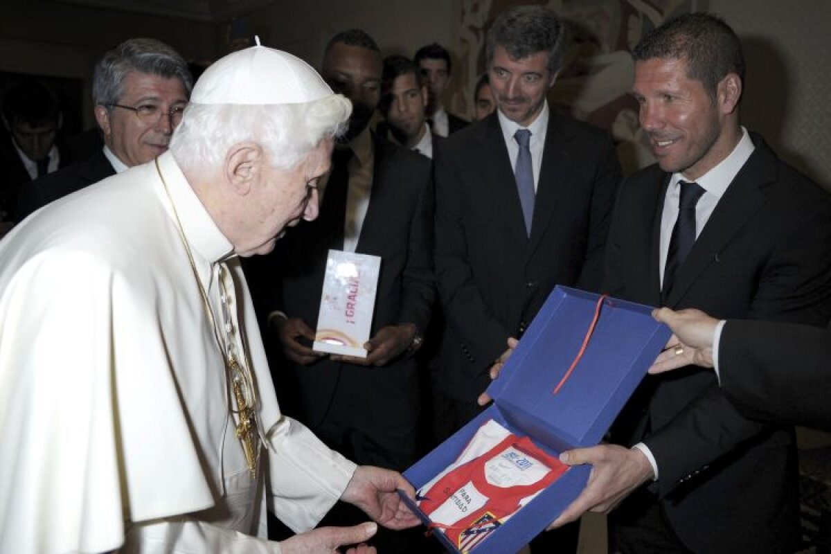 Ieri, cu o zi înaintea meciului cu Lazio, din Europa League, fotbaliştii lui Atletico Madrid au făcut o vizită specială: s-au întîlnit la Vatican cu Papa Benedict al XVI-lea, căruia antrenorul Diego Simeone (foto) i-a oferit un tricou de joc inscripţionat cu numele său.