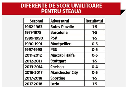 Steaua nu prea a bifat rezultate rușinoase în Europa, nu contra unor formații foarte slab cotate. A pierdut cu 0-5 acasă cu Manchester City și diferența ar fi putut fi chiar mai mare, dată fiind superioritatea evidentă și previzibilă a englezilor. Cu același scor au fost învinși roș-albaștrii la Haifa, într-o partidă cu Maccabi, însă eșecul nu a mai contat, echipa pe care o conducea Ilie Stan s-a calificat din acea grupă în primăvara Europa League.