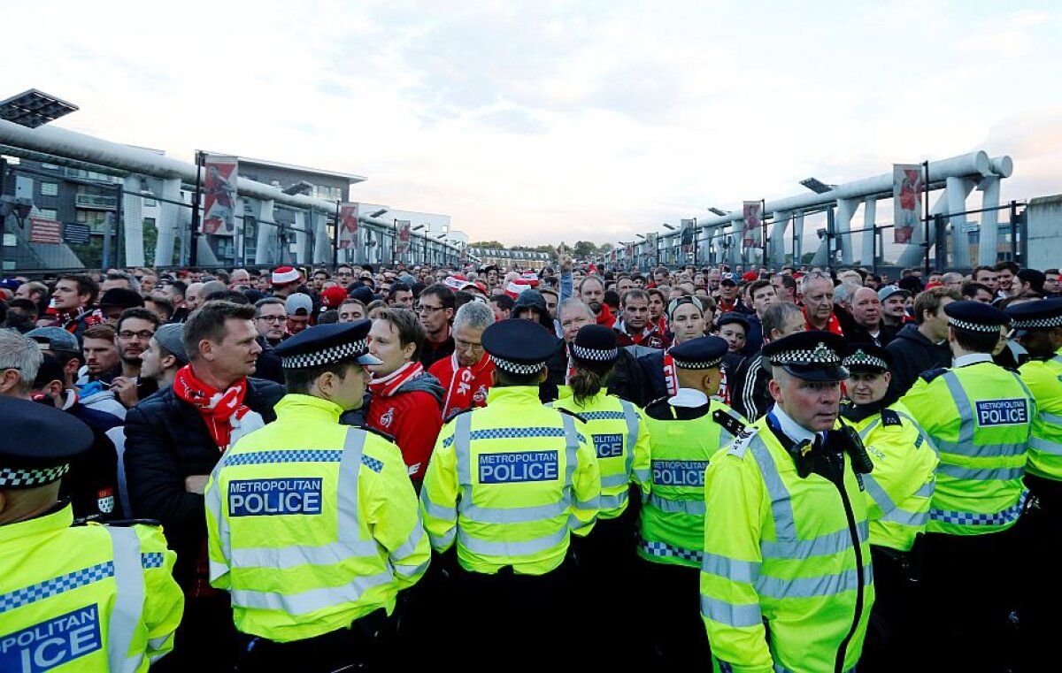 Peste 20.000 de fani ai "țapilor" au luat cu asalt străzile din jurul Emirates Stadium, aruncând sticle, fumigene și luându-se la bătaie cu forțele de ordine.