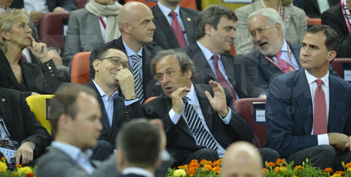 : PREȘEDINTELE PLATINI EXPLICĂ PREMIERULUI PONTA: “Cam atîta e pălăria de mare!”. Prințul Felipe al Spaniei îi ignoră, obișnuit cu coroanele. Soția lui Michel e însă atentă