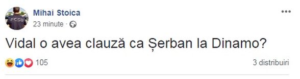 Intrigat de evoluția slabă a chilianului Arturo Vidal, MM Stoica a ținut să-l satirizeze pe mijlocașul de 31 de ani al Barcelonei, presărând totodată și o ironie la adresa marii rivale Dinamo: „Vidal o avea clauză ca Șerban la Dinamo?”, a scris oficialul stelist pe contul său de Facebook.