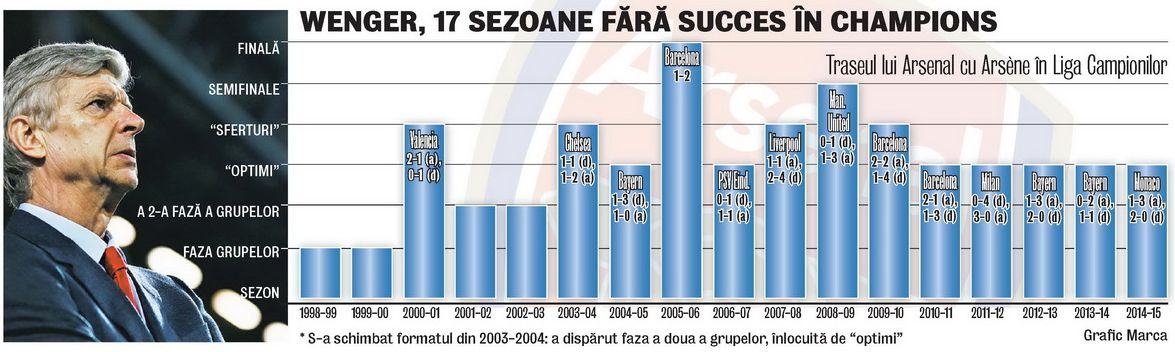 Managerul, 65 de ani, din 1996 la Londra, dă vina pe arbitru, ironizează adversarii şi, deşi iese din Ligă, remarcă "spirala pozitivă" a lui Arsenal. Dar fanii insularilor protestează: "Sîntem într-un eşec nesfîrşit. Mereu un pas în spate".