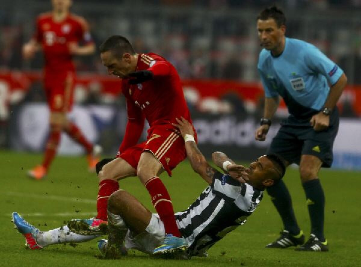 Arbitrul Clattenburg a fost îngăduitor întîi cu italienii. În prima repriză, Vidal a comis două faulturi de "galben" asupra lui Ribery, dar englezul l-a amînat pînă-n minutul 67, cînd l-a avertizat pentru henţ. Alt "protejat" a fost Chiellini, căruia i-a trecut cu vederea un cot în figura lui Mandzukici. Apoi, englezul a trecut în tabăra lui Bayern. La faza golului de 2-0, în momentul în care croatul a primit balonul, era într-o poziţie suspectă de ofsaid. În fine, pe final, Clattenburg l-a iertat de-un "roşu" pe Ribery, pentru o intrare criminală la "călăul" Vidal.