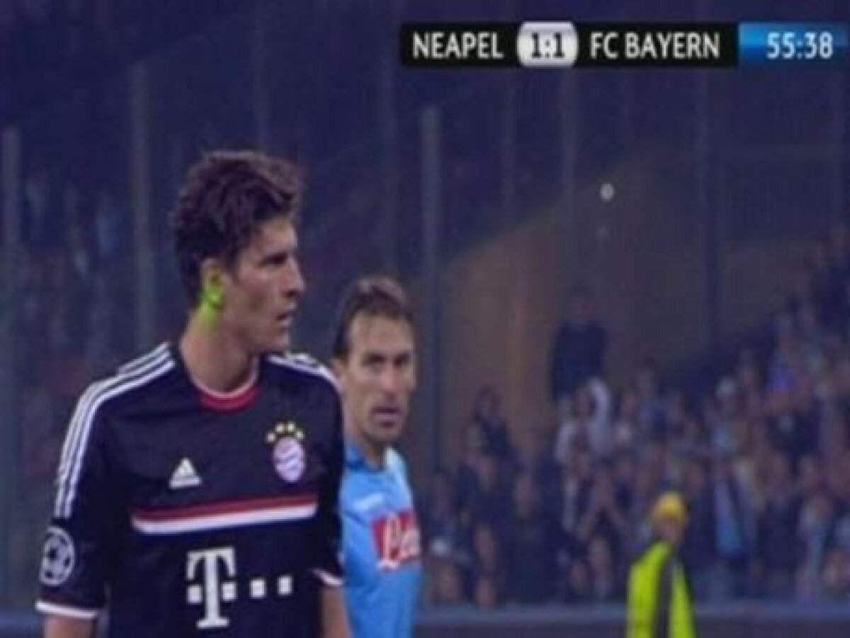Din momentul în care şi-a pregătit balonul şi pînă a executat lovitura de pedeapsă, Mario Gomez a fost sîcîit de fanii lui Napoli cu un laser. Urmarea? A tras slab, telefonat, permiţîndu-i portarului De Sanctis să blocheze balonul fără probleme.